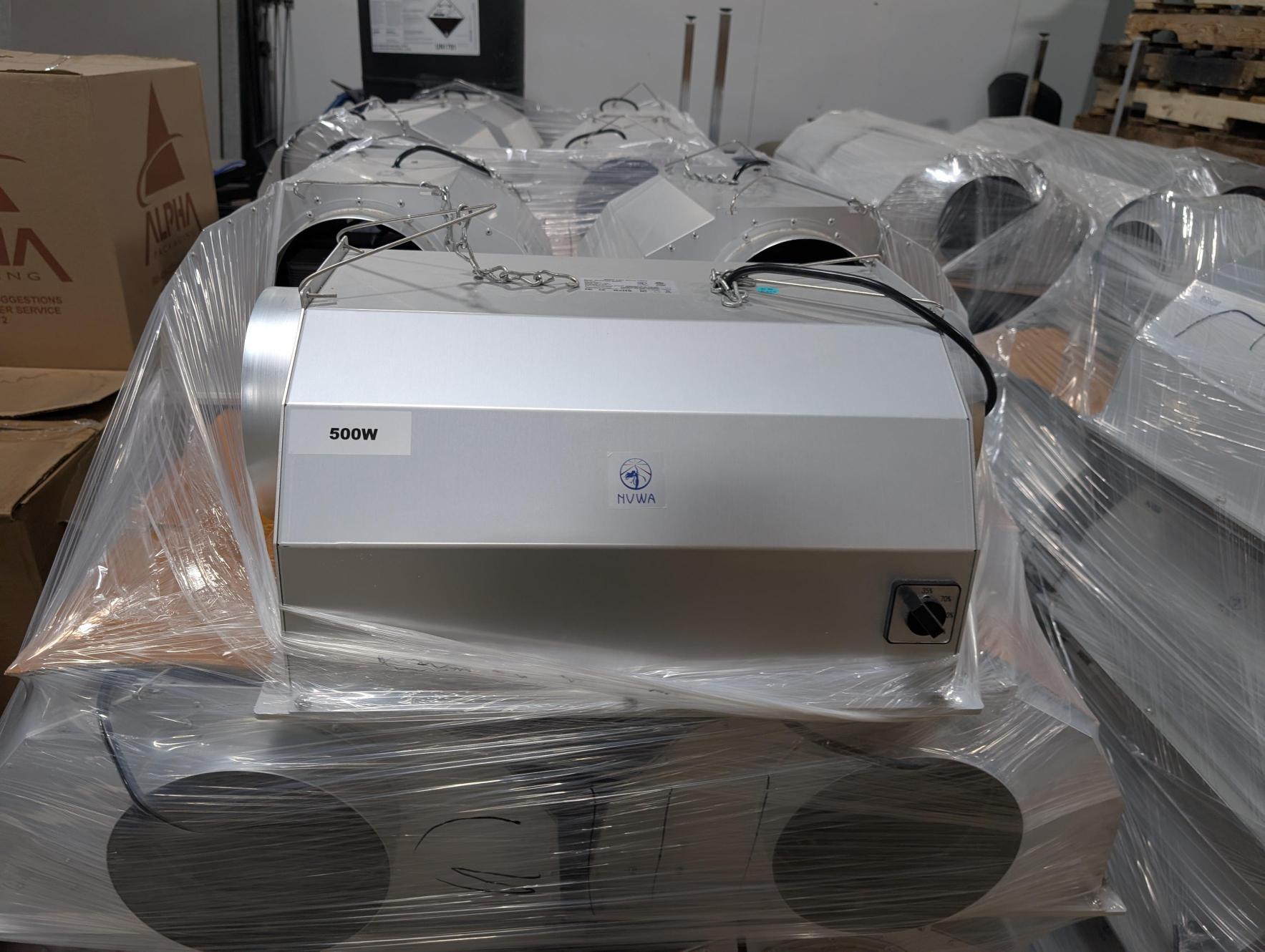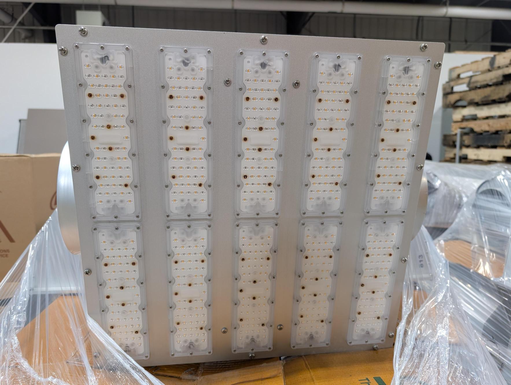 Commercial-grade 500W LED grow light fixtures integrated into air-cooled reflector housings. Designed for indoor cultivation environments requiring controlled airflow, consistent canopy coverage, and adjustable light output.